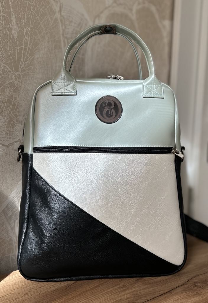 A külső oldal műbőr és textil kombinációja, bélése selyem. Az elején mély húzózáras zseb. A nyitása kétkocsis húzózárral történik. Belül húzózáras zseb, és egy gumipánt, ami a kulacsot vagy az esernyőt tarthatja. Hátoldalán állítható pánt. Fülei pantental összefoghatóak.
