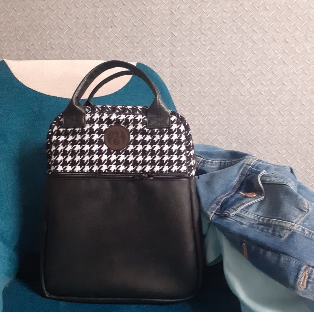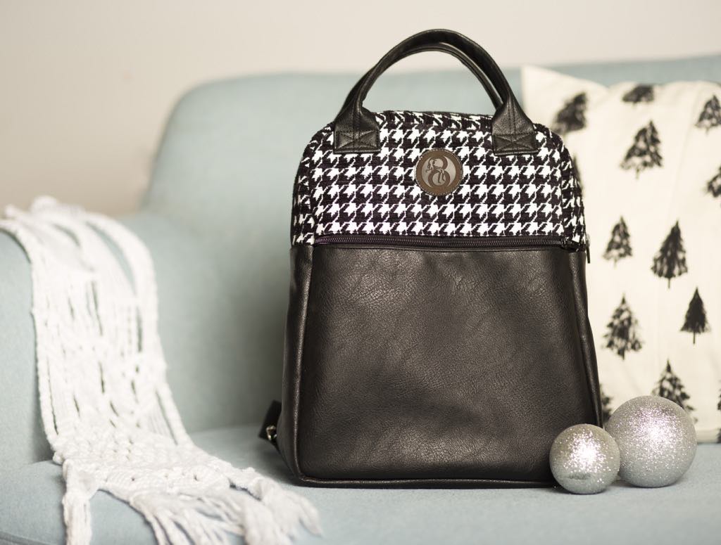 A külső oldal műbőr és textil kombinációja, bélése selyem. Az elején mély húzózáras zseb. A nyitása kétkocsis húzózárral történik. Belül húzózáras zseb, és egy gumipánt, ami a kulacsot vagy az esernyőt tarthatja. Hátoldalán állítható pánt. Fülei pantental összefoghatóak.