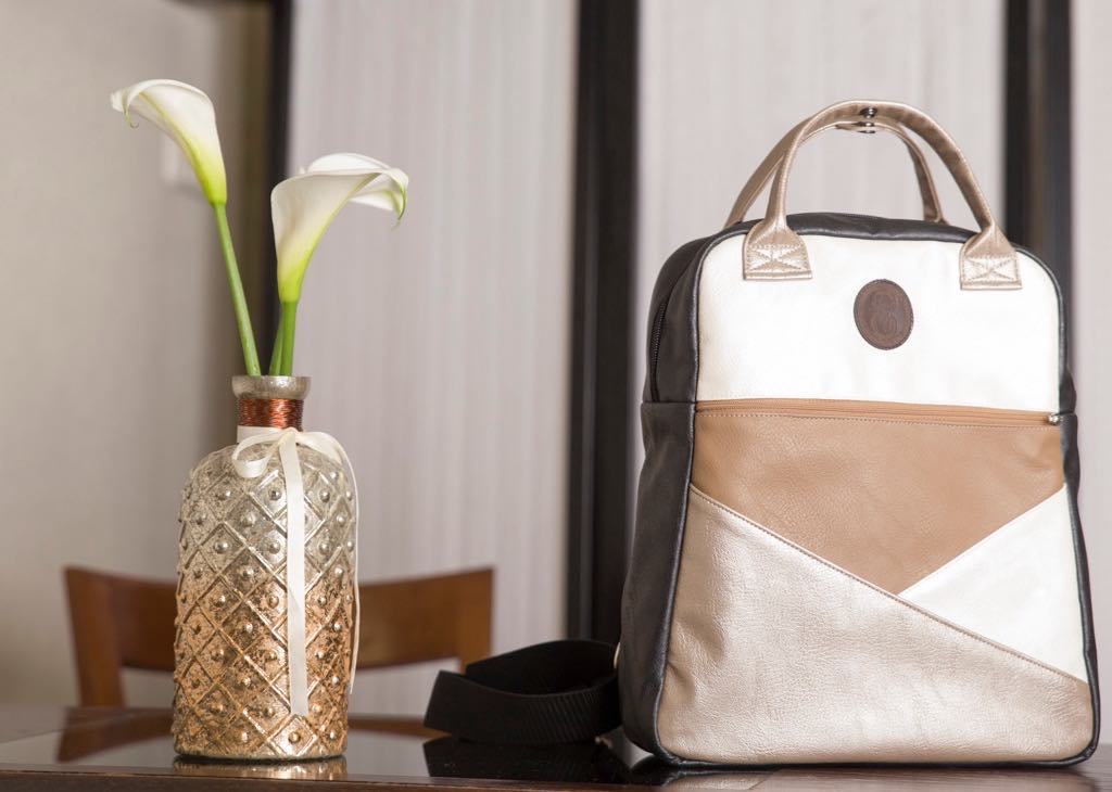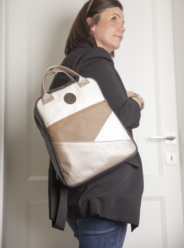 A külső oldal műbőr és textil kombinációja, bélése selyem. Az elején mély húzózáras zseb. A nyitása kétkocsis húzózárral történik. Belül húzózáras zseb, és egy gumipánt, ami a kulacsot vagy az esernyőt tarthatja. Hátoldalán állítható pánt. Fülei pantental összefoghatóak.