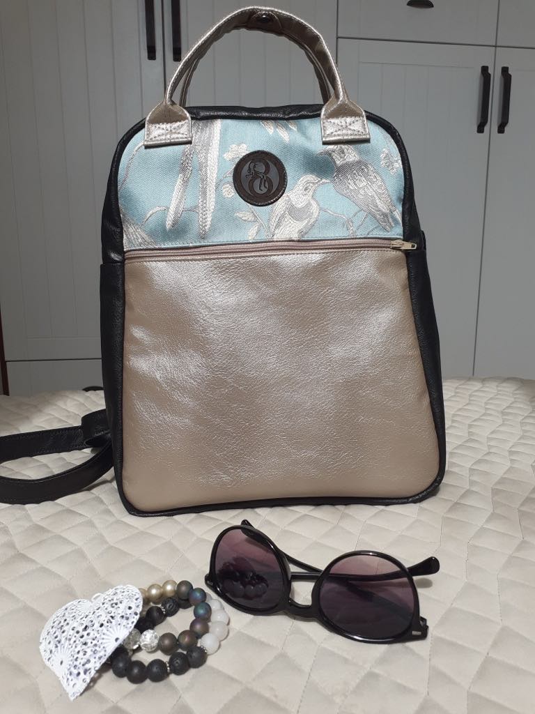 A külső oldal műbőr és textil kombinációja, bélése selyem. Az elején mély húzózáras zseb. A nyitása kétkocsis húzózárral történik. Belül húzózáras zseb, és egy gumipánt, ami a kulacsot vagy az esernyőt tarthatja. Hátoldalán állítható pánt. Fülei pantental összefoghatóak.