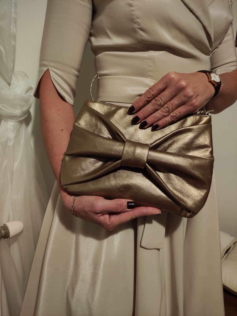 Műbőrből vagy bársonyból készült kézitáska. Külön kérésre készítünk hozzá műbőr-vagy láncpántot. A pánthoz kapcsolódó pont a frontoldalon nem látható.