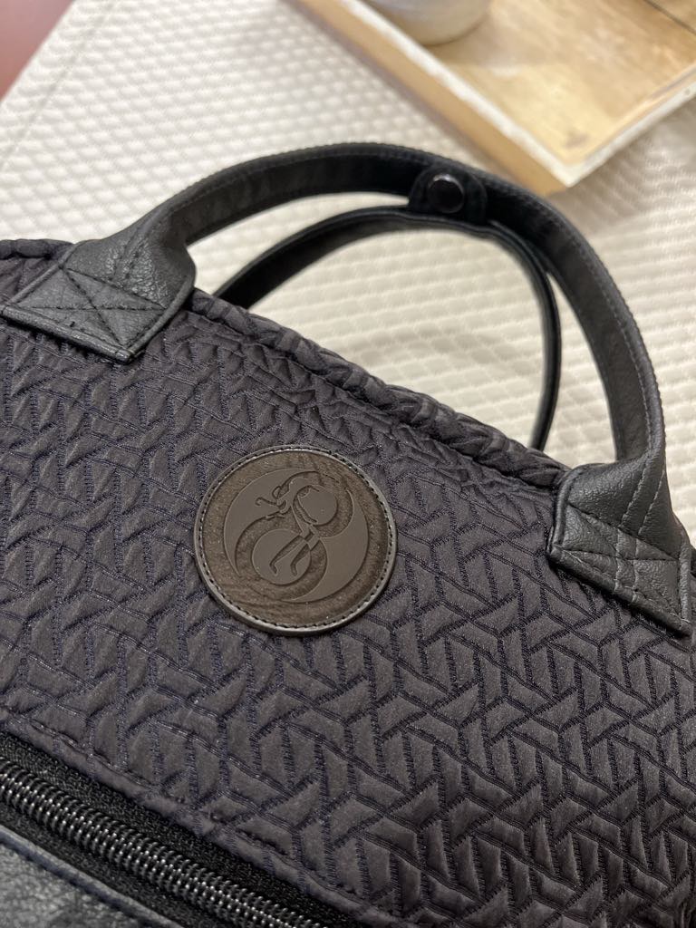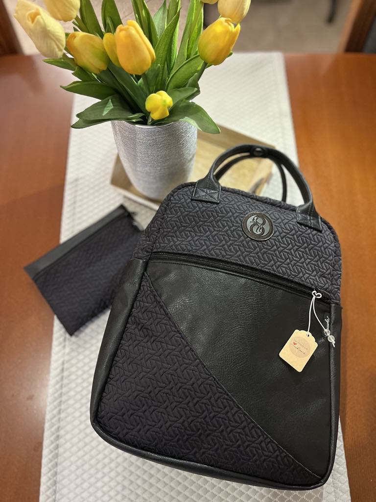 A külső oldal műbőr és textil kombinációja, bélése selyem. Az elején mély húzózáras zseb. A nyitása kétkocsis húzózárral történik. Belül húzózáras zseb, és egy gumipánt, ami a kulacsot vagy az esernyőt tarthatja. Hátoldalán állítható pánt. Fülei pantental összefoghatóak.